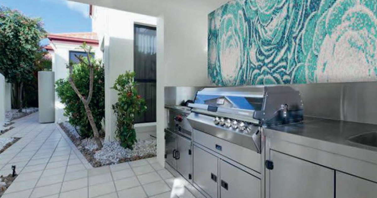 Az udvari konyhák világa ma már messze túlmutat a puszta funkcionalitáson – egy jól megtervezett kültéri főzőtér ma már élményt, stílust és karaktert is ad az otthonnak. A képen látható modern, rozsdamentes acél grillezőegységgel felszerelt szabadtéri konyha háttere egy lenyűgöző üvegmozaik pixel art fal – és ezzel meg is született a tökéletes egyensúly a technikai precizitás és a művészi megjelenés között.