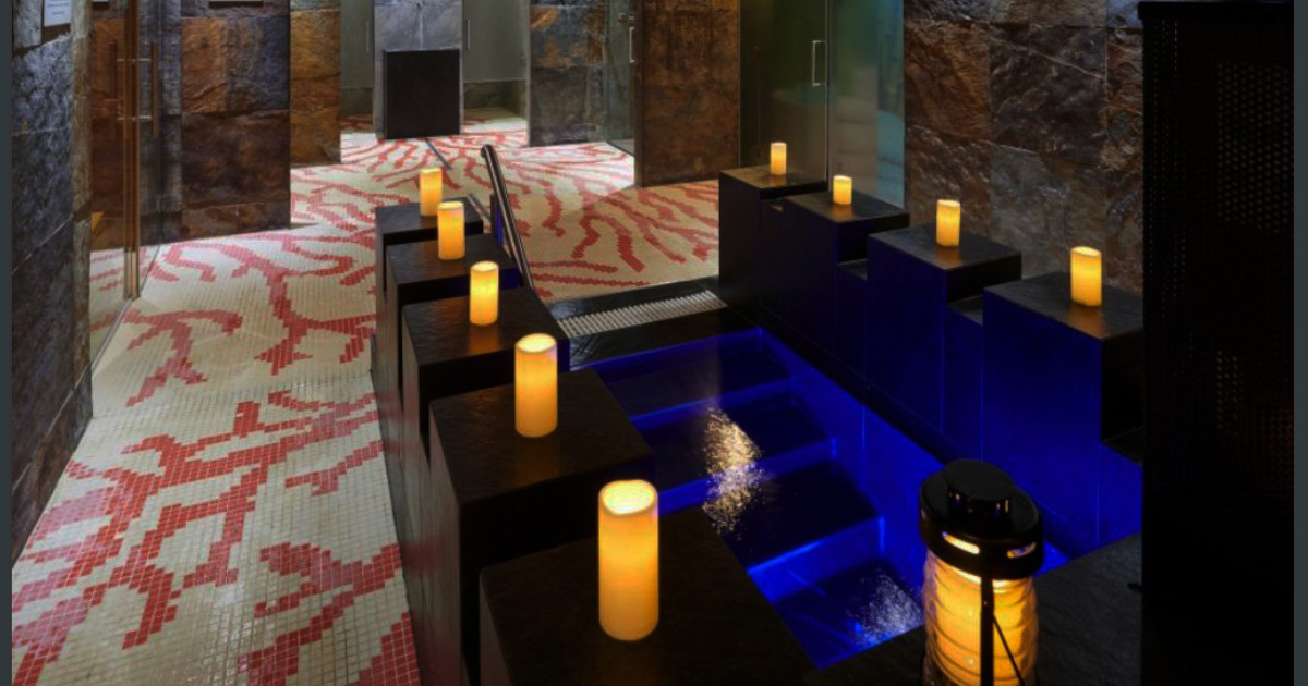 A hotel wellness részlege lenyűgözően egyedi: sötét kőburkolatok, lágyan pislákoló mécsesfények, és egy művészien megkomponált, élénk kék fényben úszó taposómedence, amely már első pillantásra külön világba repít. Az élmény azonban nemcsak a fények és formák játékában rejlik, hanem abban az aprólékos munkában is, amit a Duocolor Mozaik Stúdió üvegmozaik burkolatai tesznek hozzá az atmoszférához.
