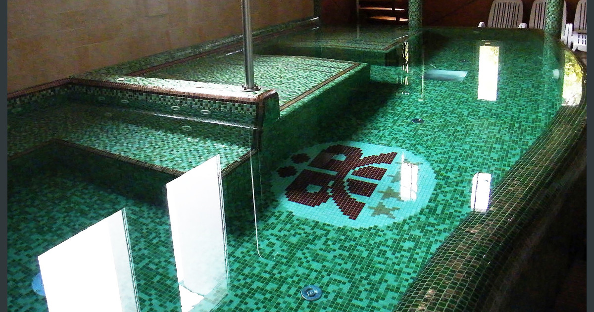A wellnessmedence már első pillantásra megragadja a tekintetet: a sötétzöld mozaikburkolat a természet mélységeit idézi, míg a közepén elhelyezett stilizált virág- vagy napmotívum igazi vizuális ékkő. A Duocolor Mozaik Stúdió által készített burkolat nem csupán funkcionális, hanem egy gondosan megkomponált dizánerfelület, amely fényben és víztükörben él igazán.