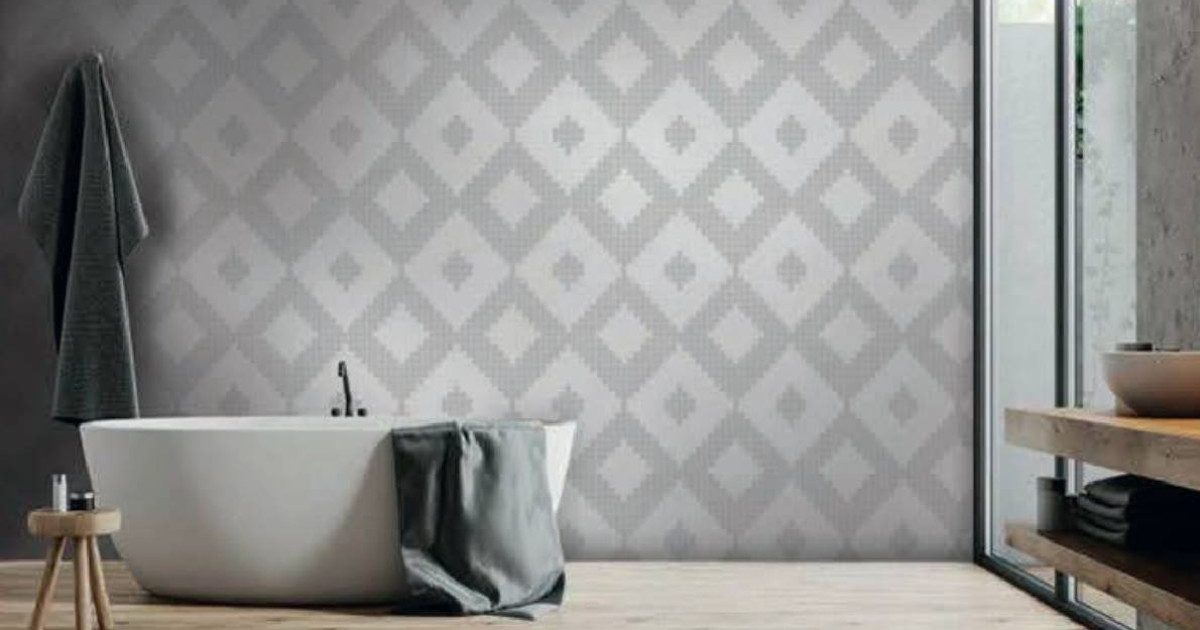 Az egyszerűségben rejlő elegancia különleges atmoszférát kölcsönöz ennek a fürdőtérnek. A szürkés árnyalatokból felépülő geometrikus mintázat modern, ugyanakkor időtlen választás: a visszafogott színek nem tolakodnak, hanem megnyugtató ritmust teremtenek. A fal diszkrét játéka olyan, mintha textil vagy tapéta borítaná, miközben a mozaik apró részleteinek köszönhetően különleges mélységet kap.